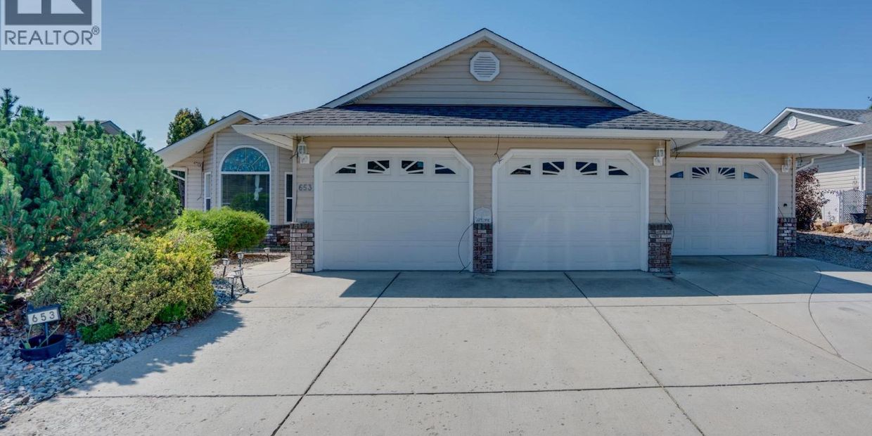 Tucked inside Desert Cove Estates, this updated rancher stands out as the only home in the community with a triple car garage - complete with workshop space, workbench, & level RV parking on the driveway. A bay window frames views toward Spallumcheen Golf Course, while vaulted ceilings & modern vinyl flooring make the living/dining area feel light & spacious. The bright white kitchen features a large island, farmhouse sink, quartz counters (2023), abundant cabinetry, a breakfast nook, & an adjoining family room with cozy gas fireplace. Recent updates deliver peace of mind: furnace/AC/HWT (2023), retaining wall (2023), washer/dryer (2022), stove & microwave (2024), & fridge (2025). Just refreshed with new interior paint, professional cleaning, & carpet cleaning - move-in ready. The king-sized primary offers a full ensuite & extra-large walk-in closet, plus a versatile den/office with separate exterior access. Outdoors, enjoy both an open patio for BBQs & covered patio for shade, overlooking private, low-maintenance backyard. Community perks include a recreation centre with an indoor (saltwater) pool, hot tub, fitness facilities, billiards/craft rooms, a full kitchen, & a robust calendar of events and exercise programs—plus on-site RV parking (subject to availability). Long-term lease to Aug, 2068. Minutes to Spallumcheen Golf & a short drive to Okanagan Lake, this home blends practical upgrades, rare garage capacity, & an active social scene into one move-in-ready package. (39144588)